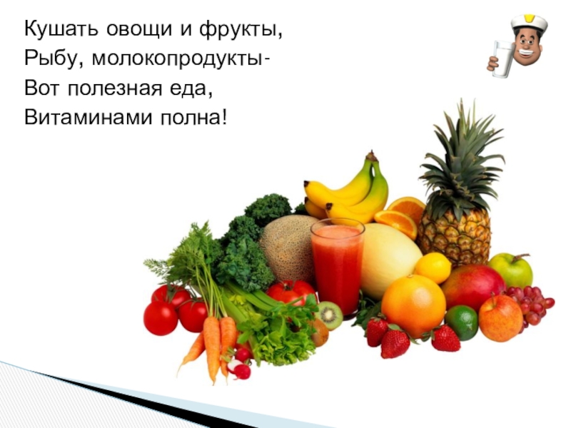 Кушать овощи и фрукты,Рыбу, молокопродукты-Вот полезная еда,Витаминами полна!