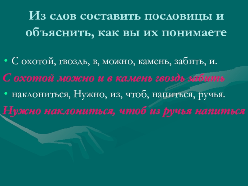 Слайд 7Из слов составить пословицы и объяснить, как вы их понимаете