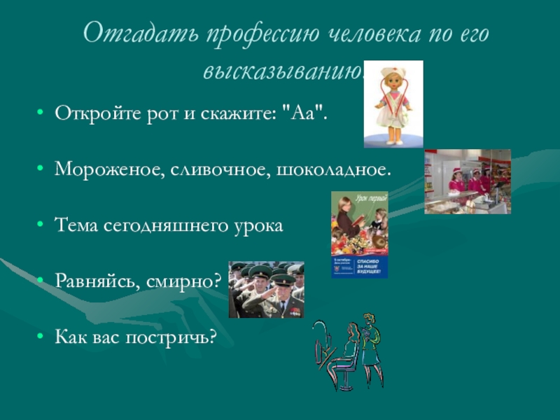 Слайд 28Отгадать профессию человека по его высказыванию.