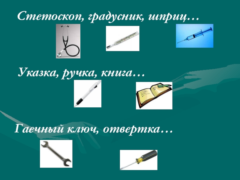 Слайд 25 Стетоскоп, градусник, шприц…