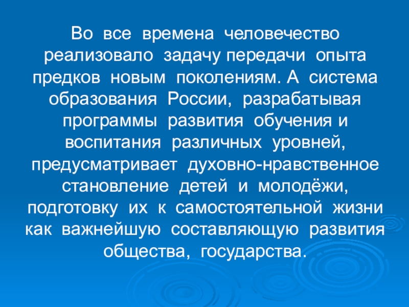 Слайд 7Во все времена человечество реализовало задачу передачи опыта предков новым поколениям.