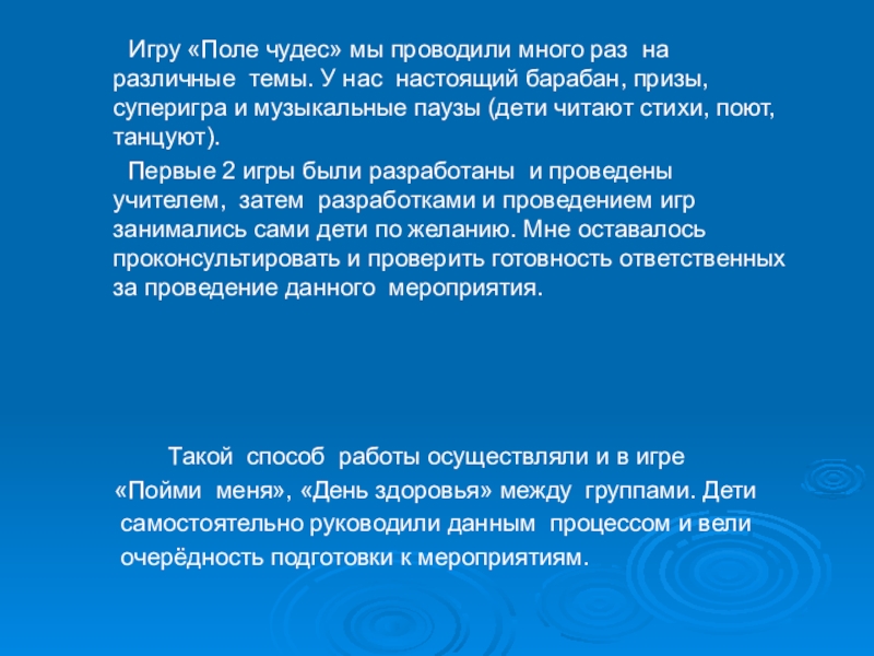 Первые 2 игры были разработаны и проведены учителем, затем разработками и проведением игр занимались сами дети по желанию. Мне оставалось проконсультировать и проверить готовность ответственных за проведение данного мероприятия.