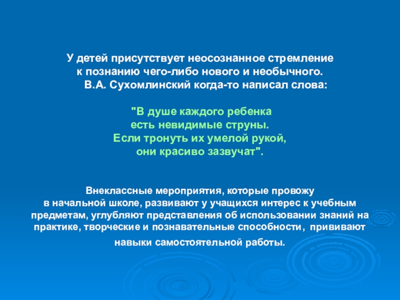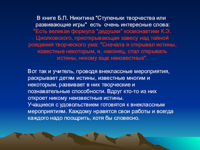 Вот так и учитель, проводя внеклассные мероприятия, раскрывает детям истины, известные многим и некоторым, развивает в них творческие и познавательные способности. Вдруг кто-то из них откроет никому неизвестные истины.