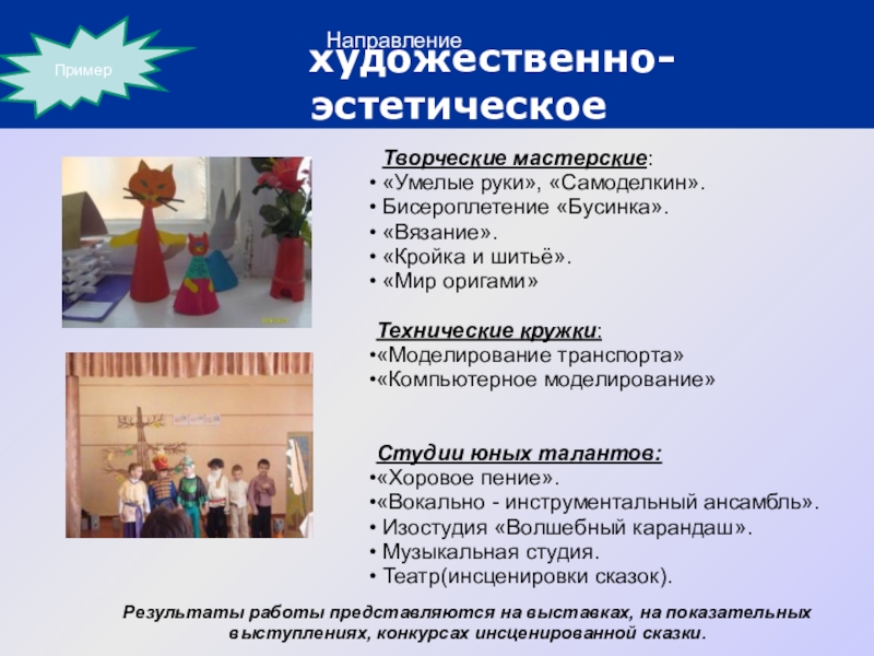 Результаты работы представляются на выставках, на показательных выступлениях, конкурсах инсценированной сказки.