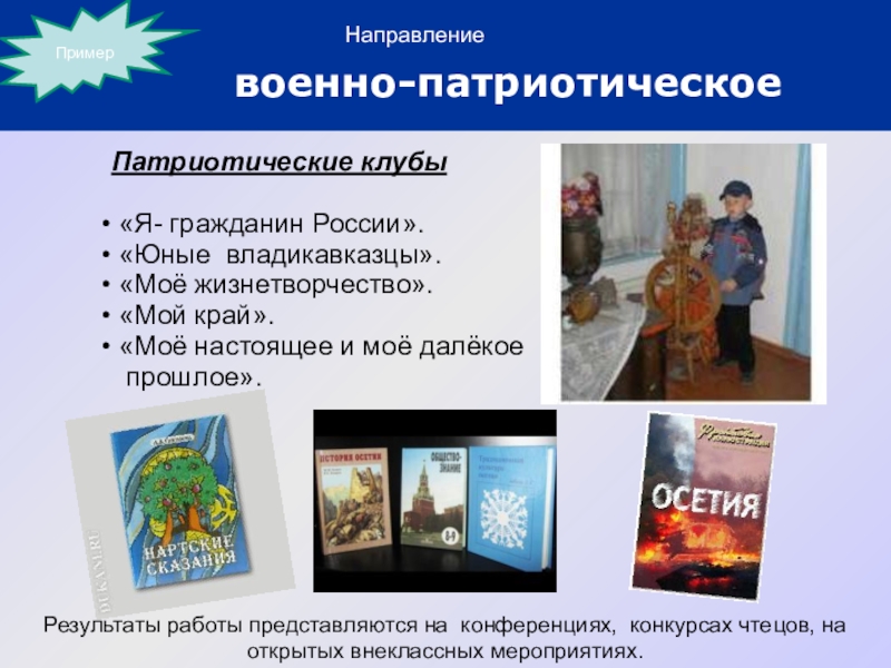 Результаты работы представляются на конференциях, конкурсах чтецов, на открытых внеклассных мероприятиях.