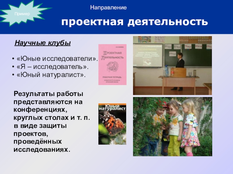 Результаты работы представляются на конференциях, круглых столах и т. п. в виде защиты проектов, проведённых исследованиях.