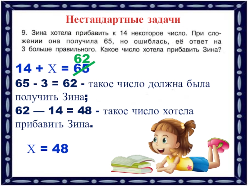 62 — 14 = 48 - такое число хотела прибавить Зина.