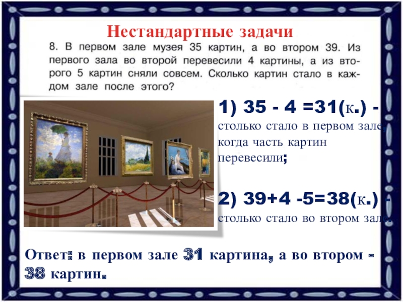 Ответ: в первом зале 31 картина, а во втором - 38 картин.