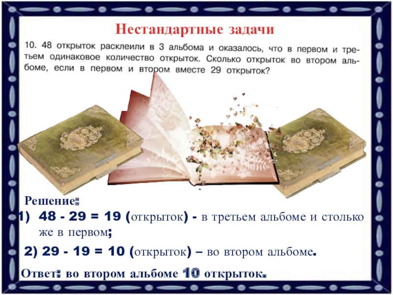 2) 29 - 19 = 10 (открыток) – во втором альбоме.