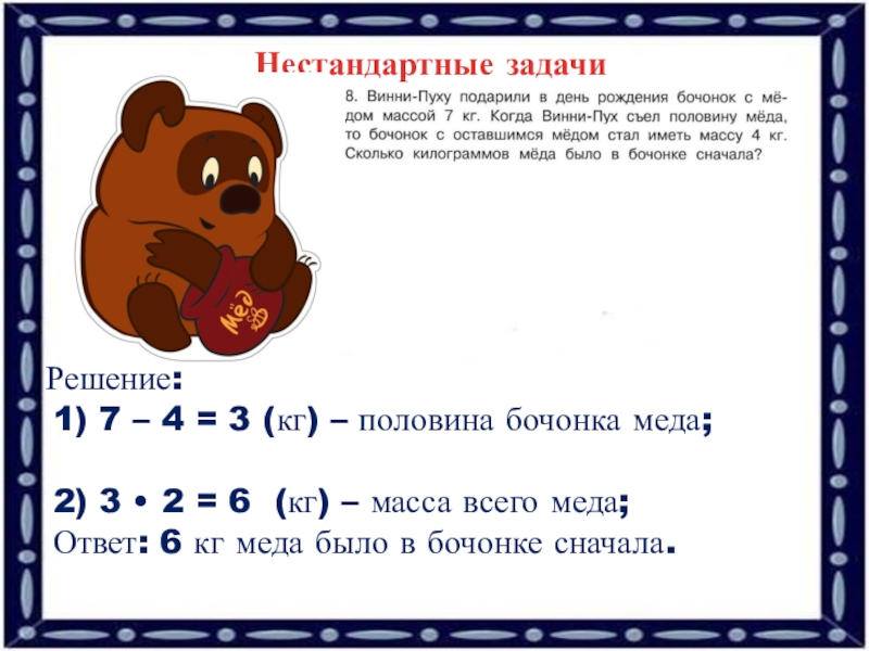 2) 3 • 2 = 6 (кг) – масса всего меда;