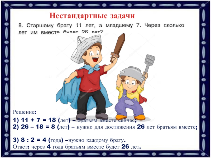 2) 26 – 18 = 8 (лет) – нужно для достижения 26 лет братьям вместе;