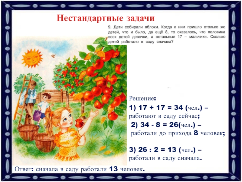 3) 26 : 2 = 13 (чел.) – работали в саду сначала.