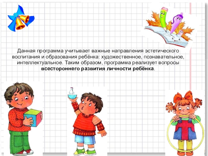 Данная программа учитывает важные направления эстетического воспитания и образования ребёнка: художественное,