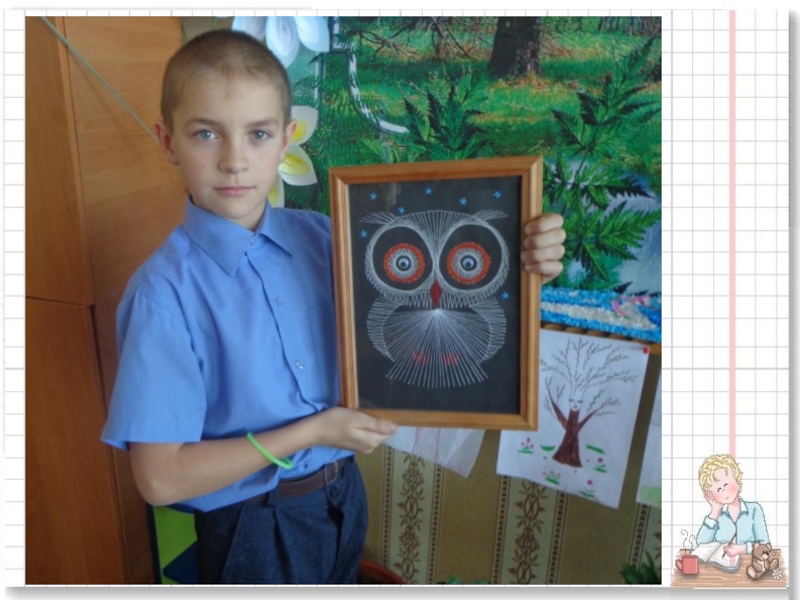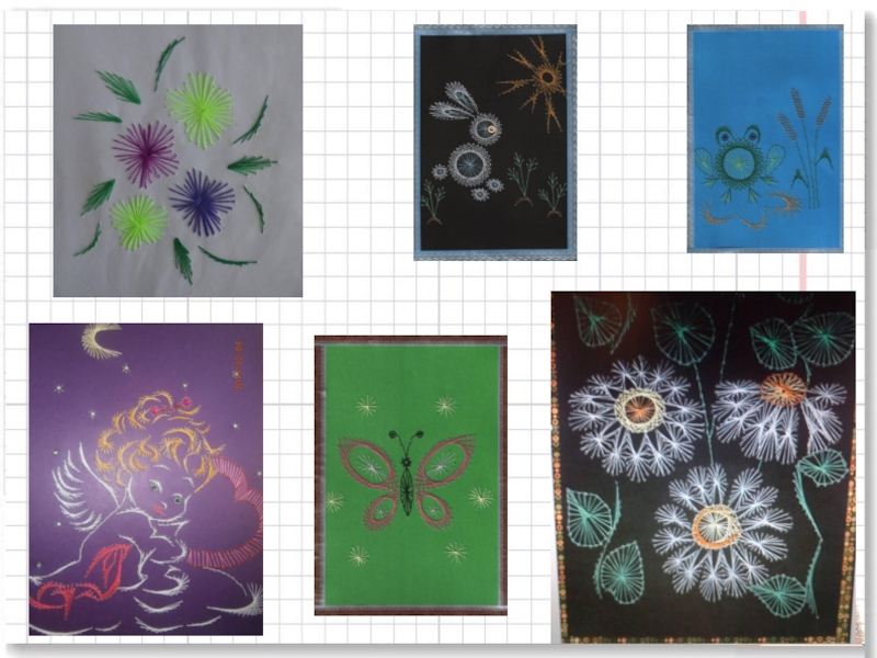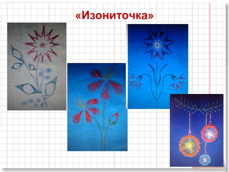 «Изониточка» – техника, напоминающая вышивание. Она заключается в создании художественного образа путём пересечения цветных нитей на картоне.