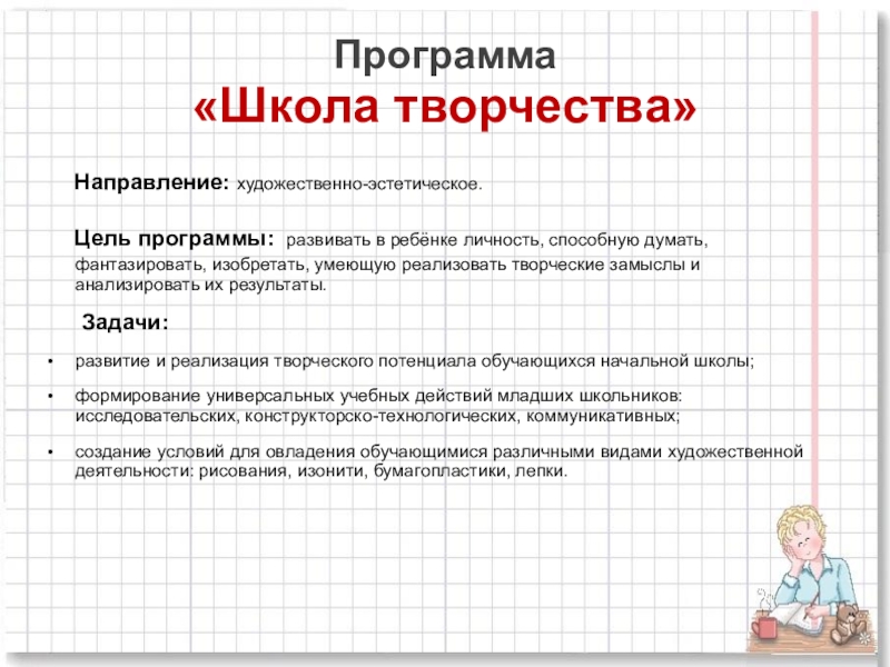 Программа «Школа творчества» Направление: художественно-эстетическое. Цель программы: развивать в ребёнке личность, способную думать, фантазировать, изобретать, умеющую реализовать творческие замыслы и анализировать их результаты. Задачи:развитие и реализация творческого потенциала обучающихся начальной