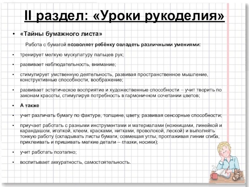 II раздел: «Уроки рукоделия» «Тайны бумажного листа»     Работа с бумагой позволяет ребёнку овладеть