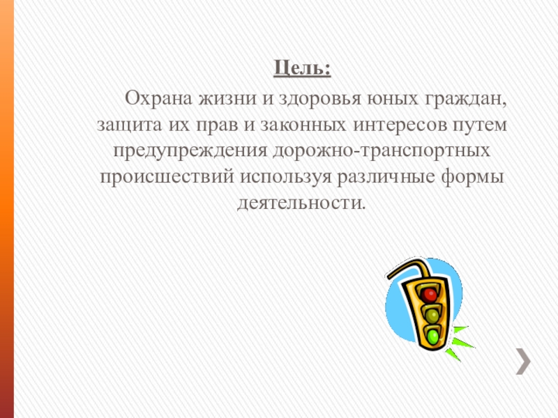 Цель: Охрана жизни и здоровья юных граждан, защита их прав и законных интересов путем предупреждения дорожно-транспортных происшествий используя различные формы деятельности.
