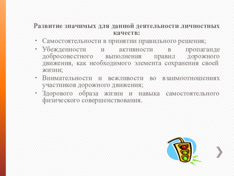 и активности в пропаганде добросовестного выполнения правил дорожного движения, как необходимого элемента сохранения своей жизни;