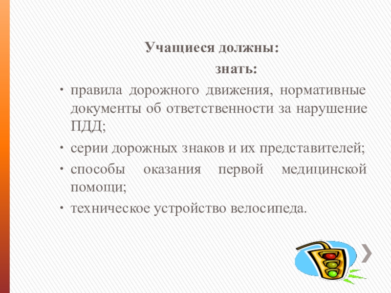 Учащиеся должны:       знать:правила дорожного движения, нормативные документы об ответственности за нарушение