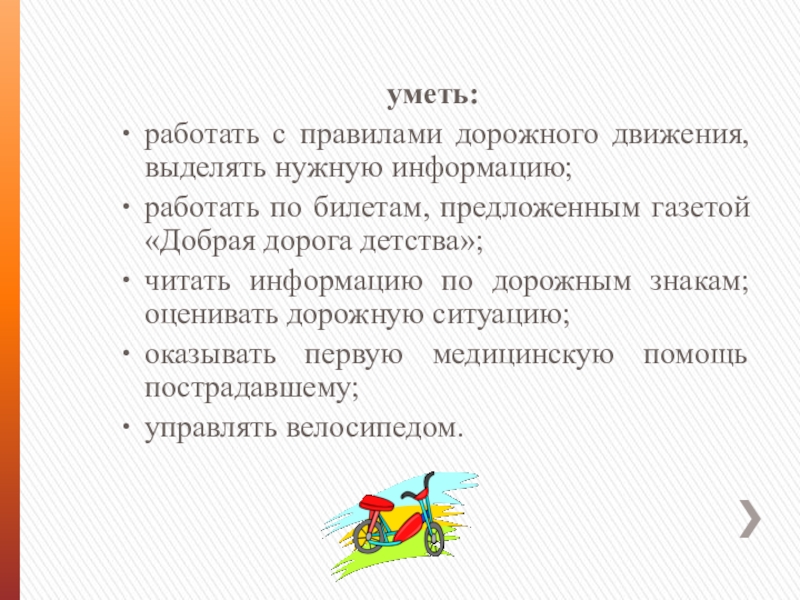 уметь:работать с правилами дорожного движения, выделять нужную информацию;работать по билетам, предложенным газетой «Добрая дорога детства»;читать информацию по