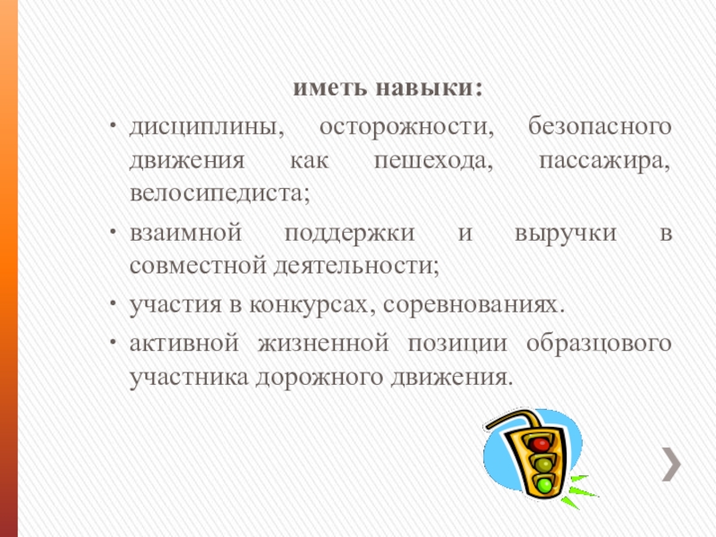 иметь навыки:дисциплины, осторожности, безопасного движения как пешехода, пассажира, велосипедиста;взаимной поддержки и выручки в совместной деятельности;участия в конкурсах,