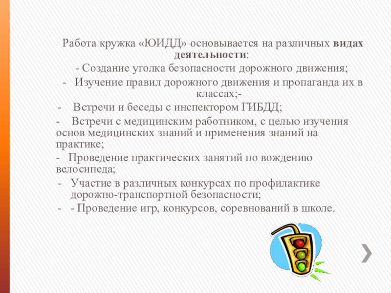 Работа кружка «ЮИДД» основывается на различных видах деятельности:- Создание уголка безопасности дорожного движения;Изучение правил дорожного движения