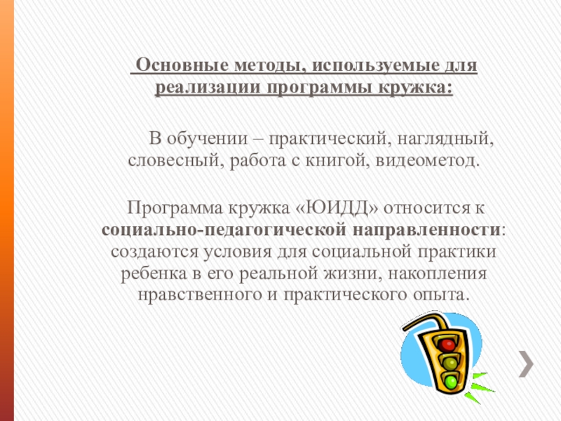 Программа кружка «ЮИДД» относится к социально-педагогической направленности: создаются условия для социальной практики ребенка в его реальной жизни, накопления нравственного и практического опыта.