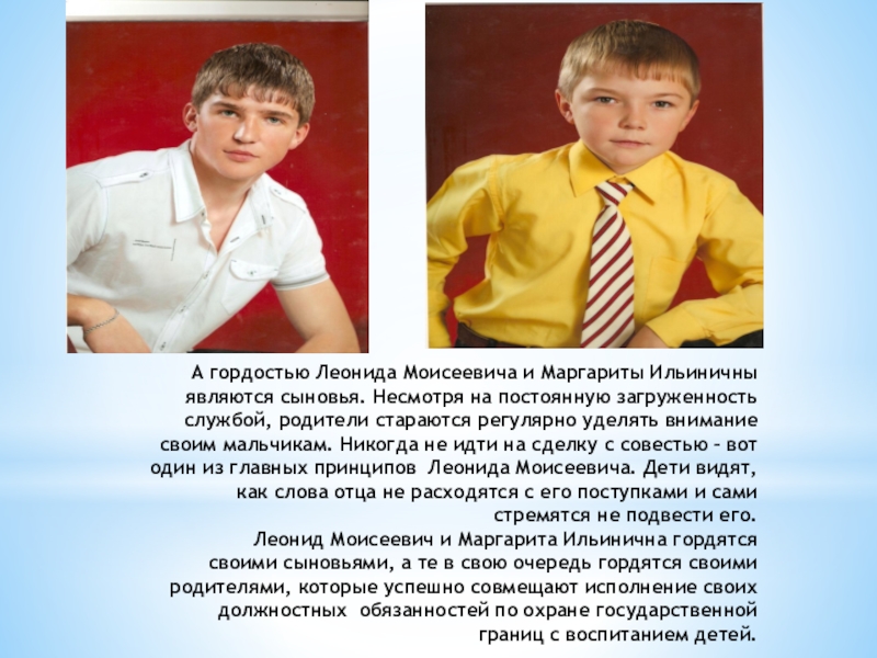 постоянную загруженность службой, родители стараются регулярно уделять внимание своим мальчикам. Никогда не идти на сделку с совестью – вот один из главных принципов Леонида Моисеевича. Дети видят, как слова отца не расходятся с его поступками и сами стремятся не подвести его. Леонид Моисеевич и Маргарита Ильинична гордятся своими сыновьями, а те в свою очередь гордятся своими родителями, которые успешно совмещают исполнение своих должностных обязанностей по охране государственной границ с воспитанием детей.