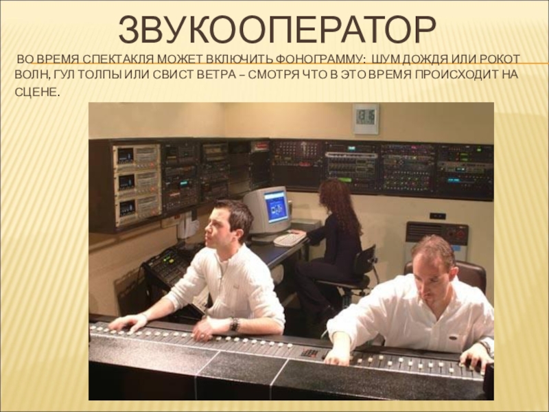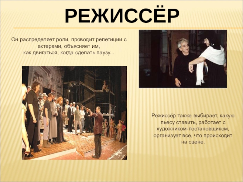 Режиссёр также выбирает, какую пьесу ставить, работает с художником-постановщиком,
