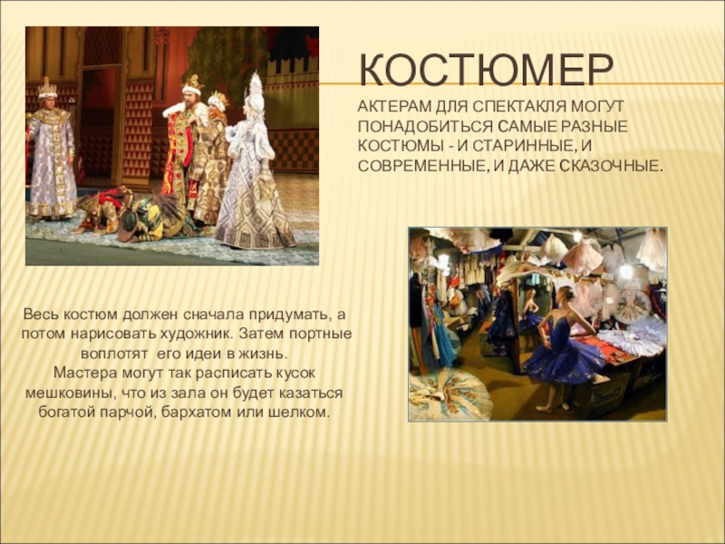 Весь костюм должен сначала придумать, а потом нарисовать художник. Затем портные воплотят его идеи в жизнь.