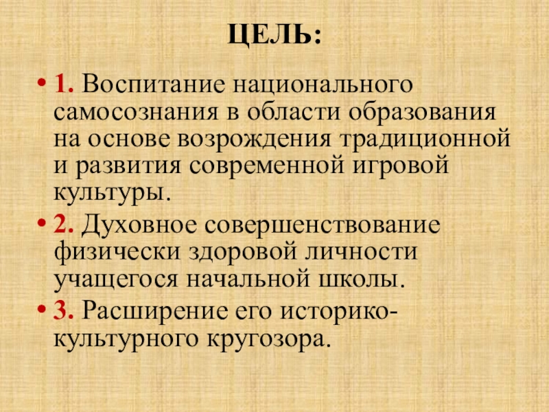 ЦЕЛЬ: 1. Воспитание национального самосознания в области образования на основе возрождения традиционной и развития современной игровой культуры.2.