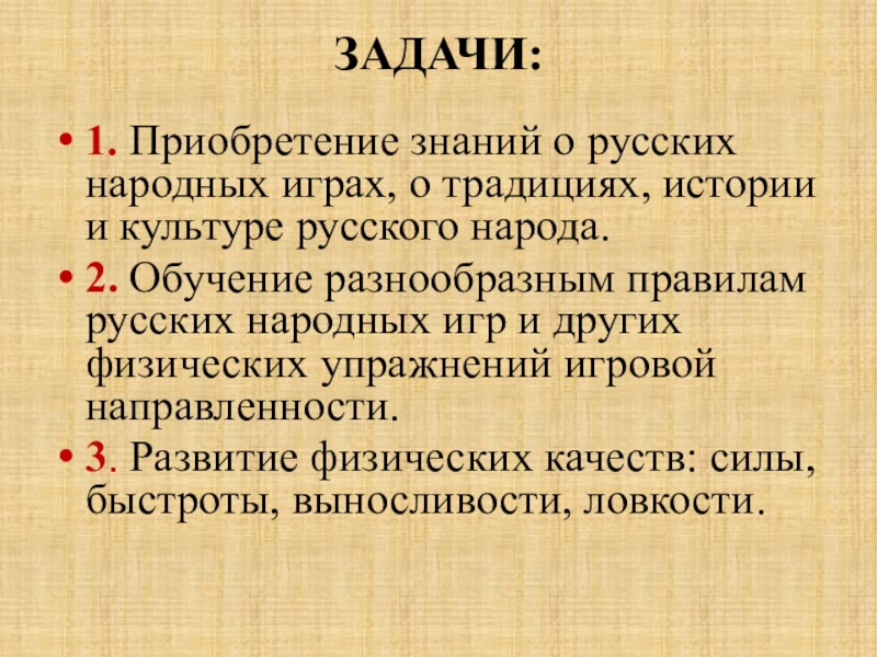 ЗАДАЧИ: 1. Приобретение знаний о русских народных играх, о традициях, истории и культуре русского народа.2. Обучение разнообразным