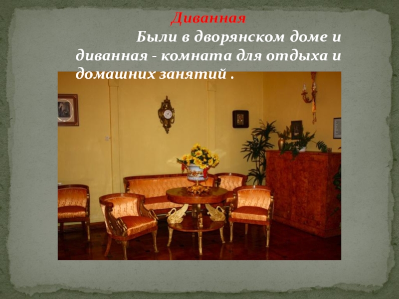Были в дворянском доме и диванная - комната для отдыха и домашних занятий .