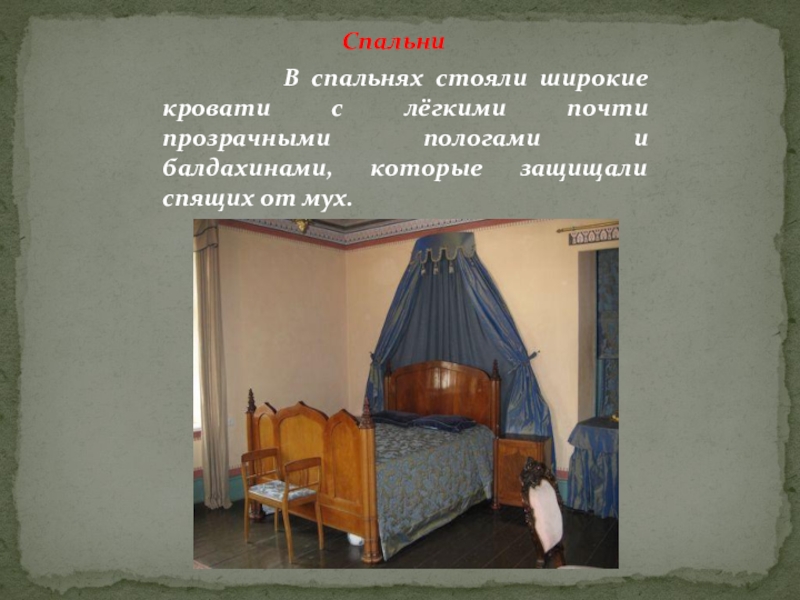 В спальнях стояли широкие кровати с лёгкими почти прозрачными пологами и балдахинами, которые защищали спящих от мух.