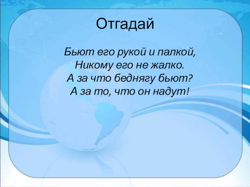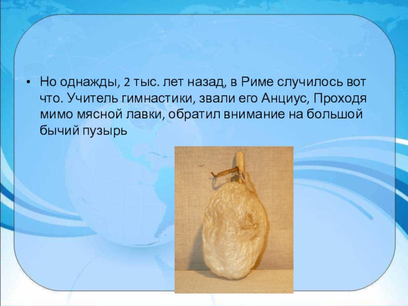 Слайд 30Надутый воздухом и перевязанный веревкой, он висел над входной дверью для