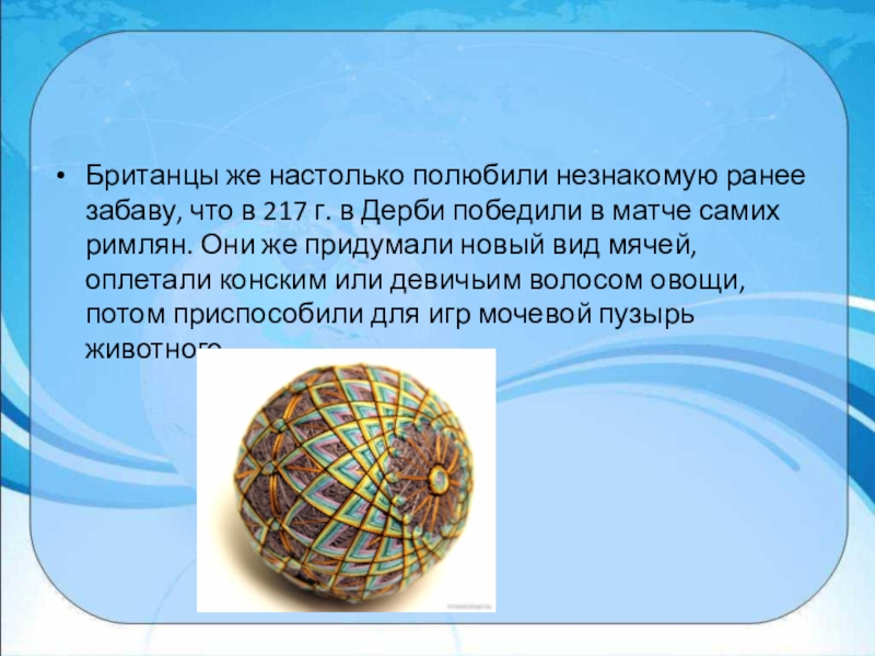 в Дерби победили в матче самих римлян. Они же придумали новый вид мячей, оплетали конским или девичьим волосом овощи, потом приспособили для игр мочевой пузырь животного.