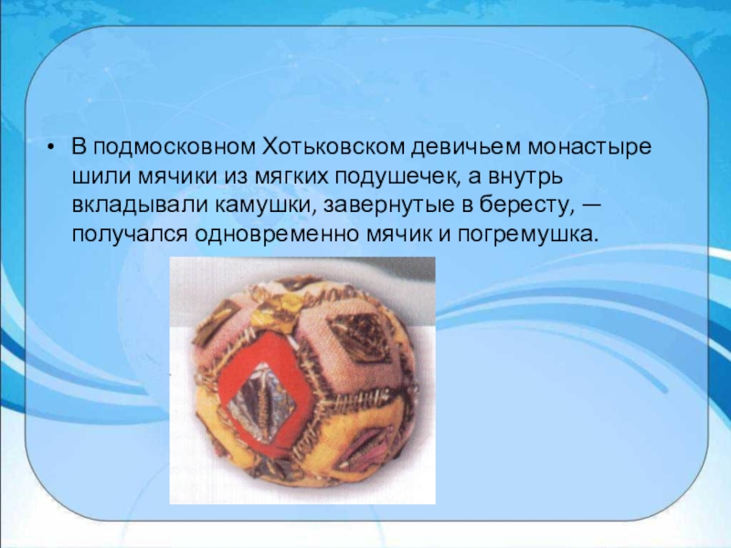 Слайд 37В подмосковном Хотьковском девичьем монастыре шили мячики из мягких подушечек, а