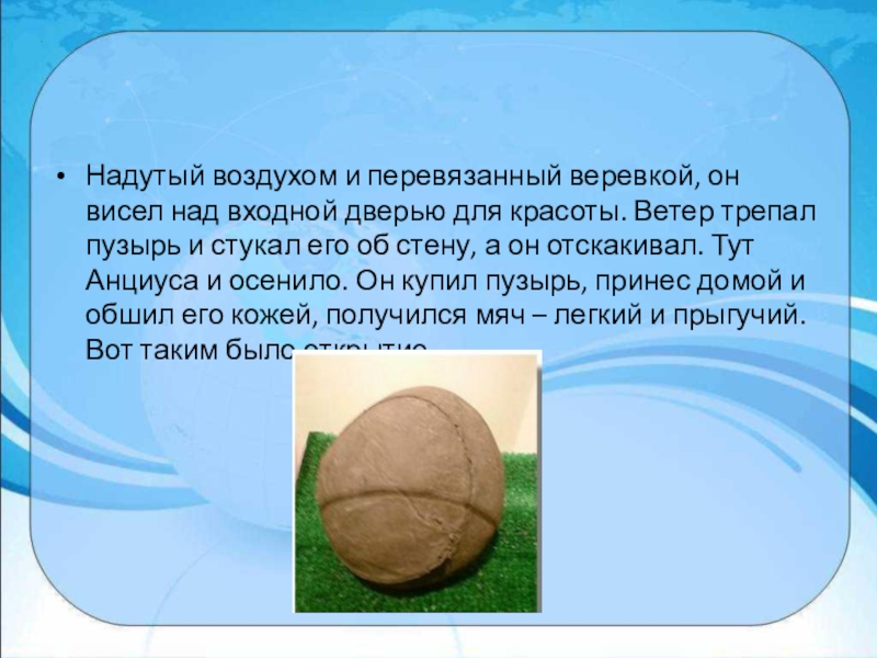 красоты. Ветер трепал пузырь и стукал его об стену, а он отскакивал. Тут Анциуса и осенило. Он купил пузырь, принес домой и обшил его кожей, получился мяч – легкий и прыгучий. Вот таким было открытие.