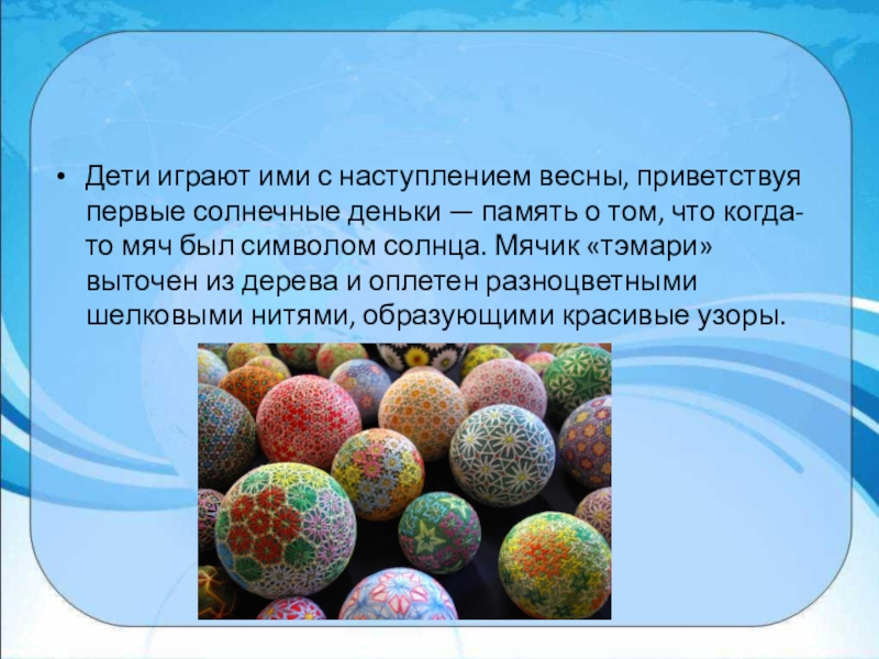 память о том, что когда-то мяч был символом солнца. Мячик «тэмари» выточен из дерева и оплетен разноцветными шелковыми нитями, образующими красивые узоры.