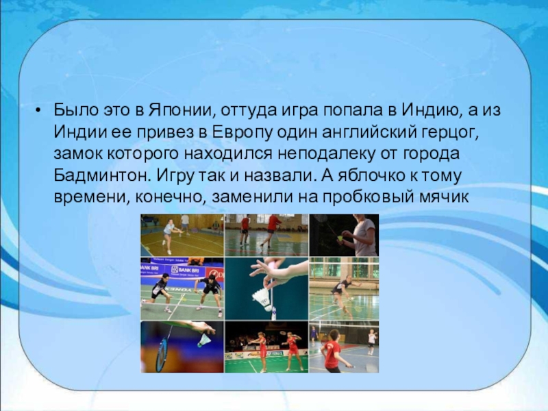 Индии ее привез в Европу один английский герцог, замок которого находился неподалеку от города Бадминтон. Игру так и назвали. А яблочко к тому времени, конечно, заменили на пробковый мячик