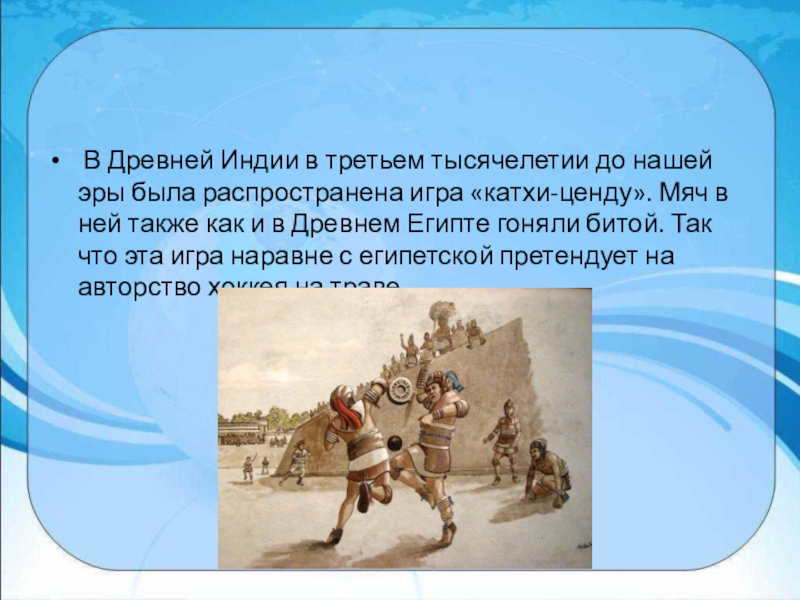 игра «катхи-ценду». Мяч в ней также как и в Древнем Египте гоняли битой. Так что эта игра наравне с египетской претендует на авторство хоккея на траве.