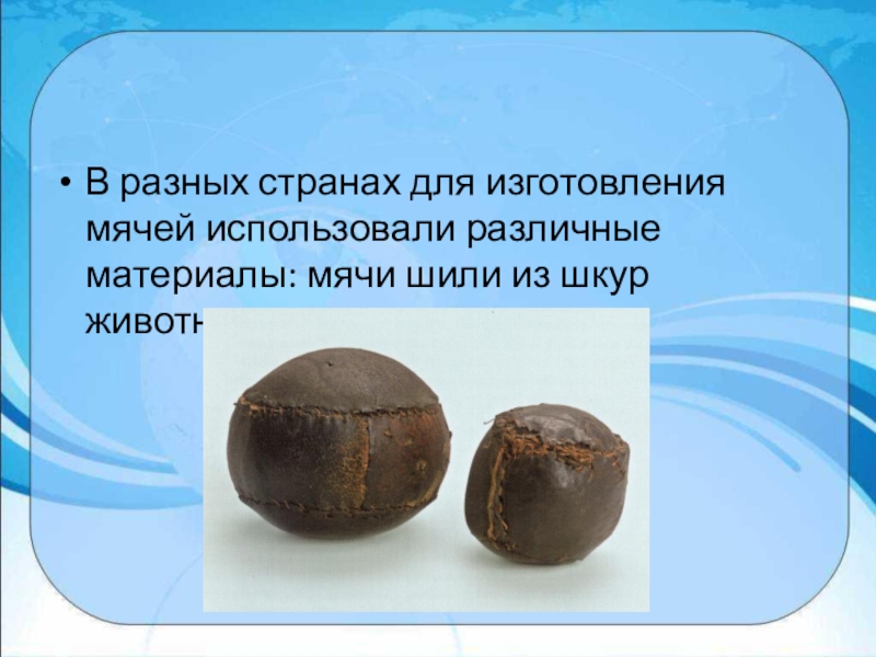 Слайд 11В разных странах для изготовления мячей использовали различные материалы: мячи шили