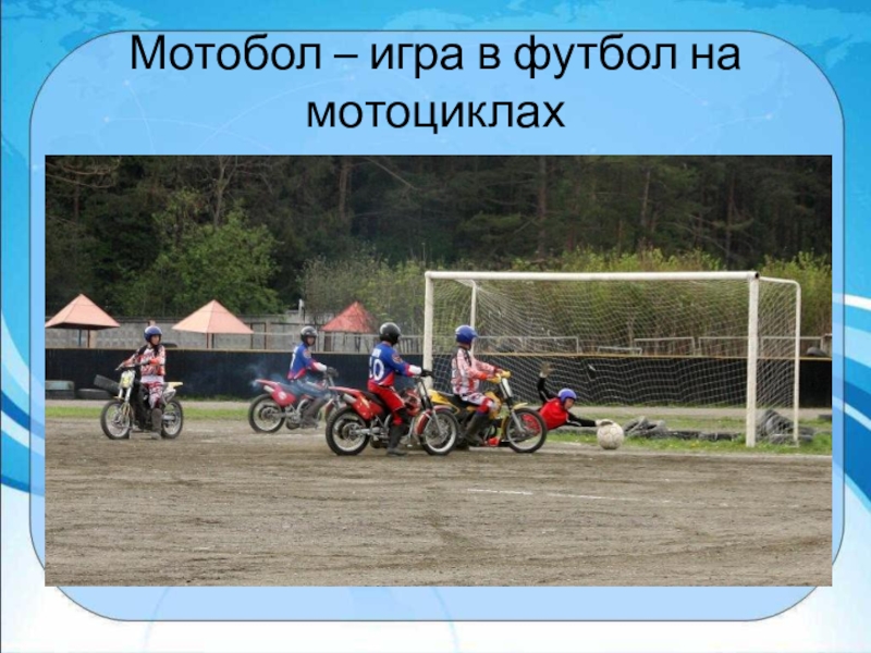 Слайд 46Мотобол – игра в футбол на мотоциклах