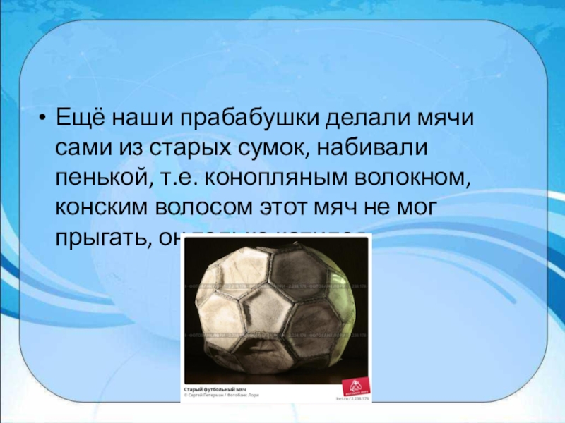 Слайд 39Ещё наши прабабушки делали мячи сами из старых сумок, набивали пенькой,