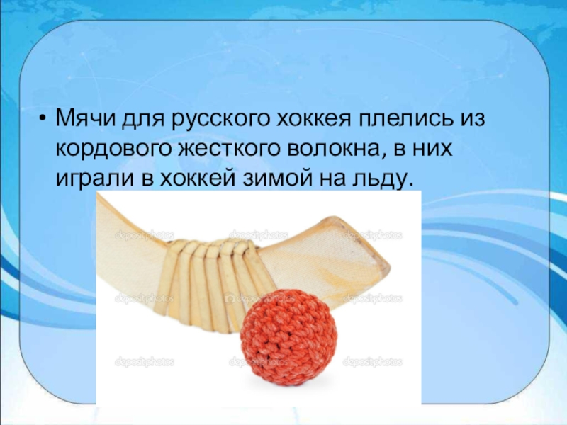 Слайд 41Мячи для русского хоккея плелись из кордового жесткого волокна, в них
