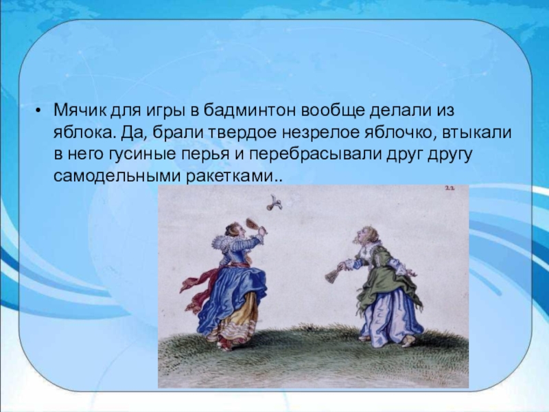 Слайд 22Мячик для игры в бадминтон вообще делали из яблока. Да, брали