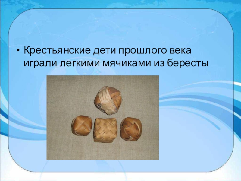 Слайд 34Крестьянские дети прошлого века играли легкими мячиками из бересты