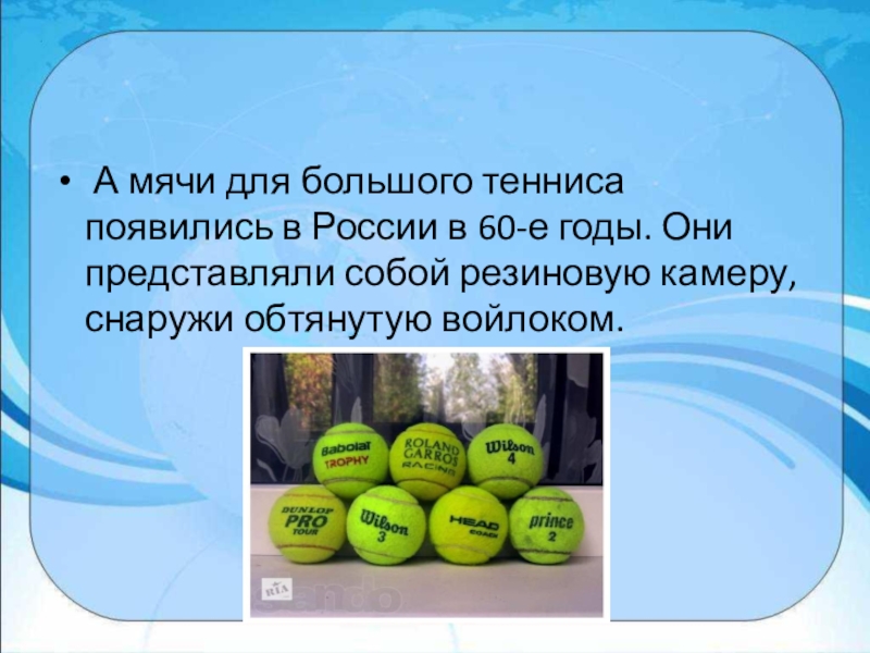 Слайд 42 А мячи для большого тенниса появились в России в 60-е годы.
