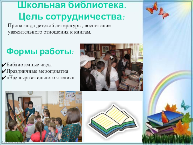 Слайд 19Школьная библиотека. Цель сотрудничества: