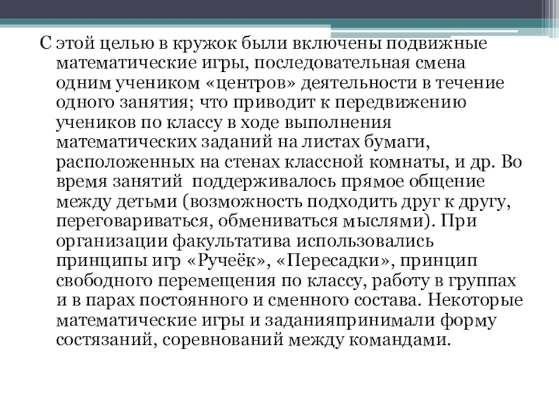 смена одним учеником «центров» деятельности в течение одного занятия; что приводит к передвижению учеников по классу в ходе выполнения математических заданий на листах бумаги, расположенных на стенах классной комнаты, и др. Во время занятий поддерживалось прямое общение между детьми (возможность подходить друг к другу, переговариваться, обмениваться мыслями). При организации факультатива использовались принципы игр «Ручеёк», «Пересадки», принцип свободного перемещения по классу, работу в группах и в парах постоянного и сменного состава. Некоторые математические игры и заданияпринимали форму состязаний, соревнований между командами.